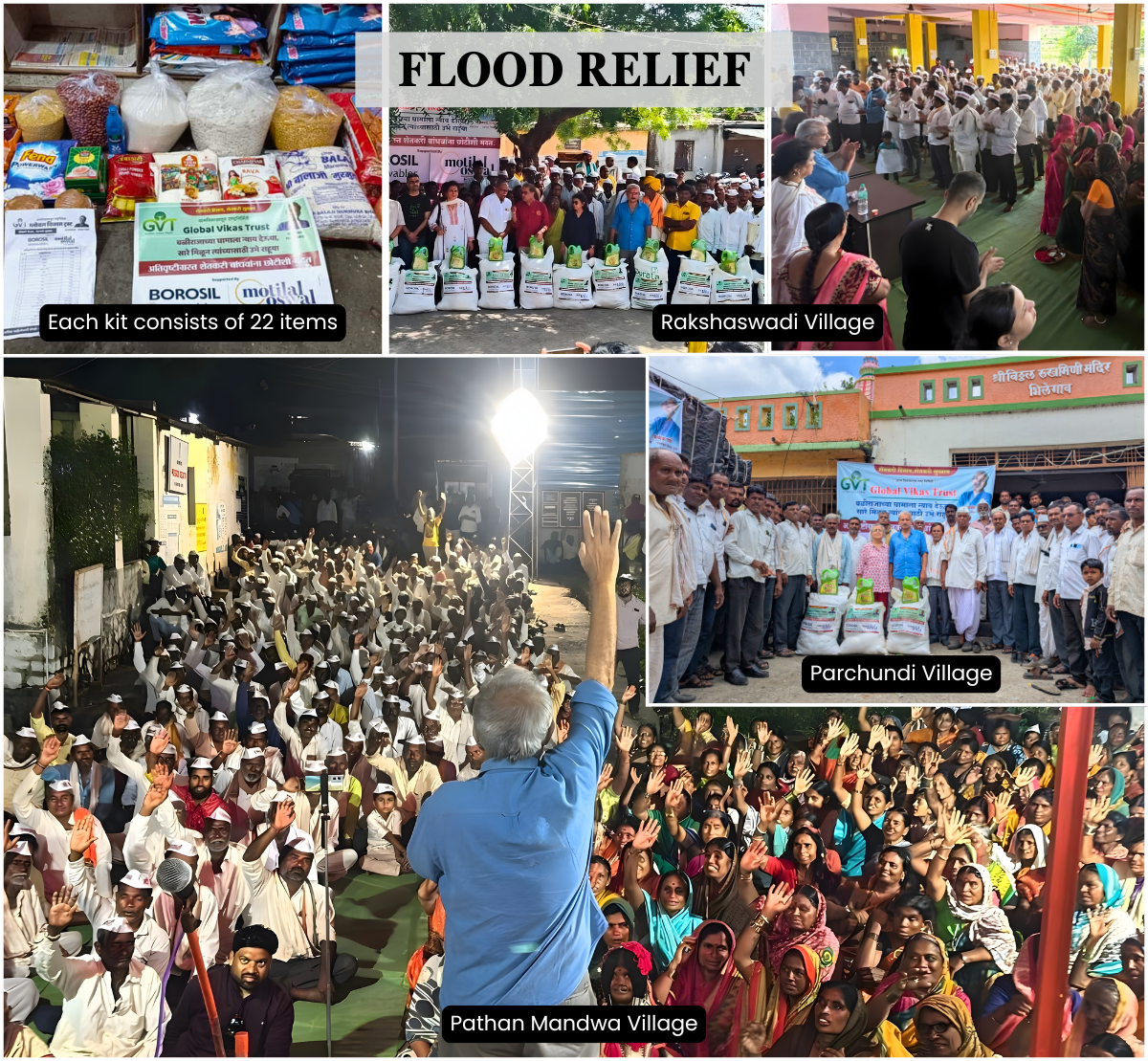 "Global Vikas Trust distributes essential food kits across 16 villages, spreading hope and festive cheer to flood-affected farmers."